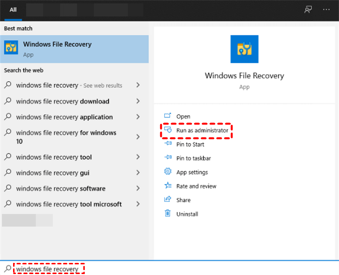 Paso 2. Introduce "Windows File Recovery" en la barra de búsqueda y luego haz clic en el botón "Ejecutar como administrador".