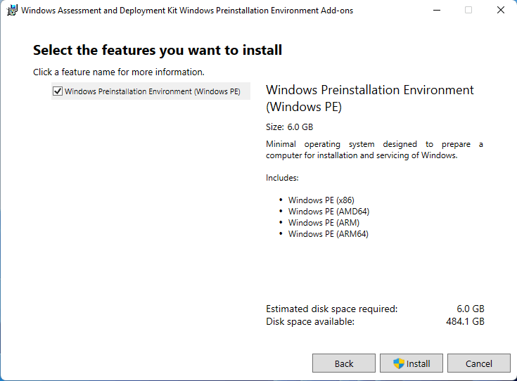 - El Entorno de preinstalación de Windows (Windows PE) como una descarga separada del Kit de evaluación e implementación (ADK). Para agregar Windows PE a su instalación de ADK, descargue e instale el complemento de Windows PE después de instalar el ADK.