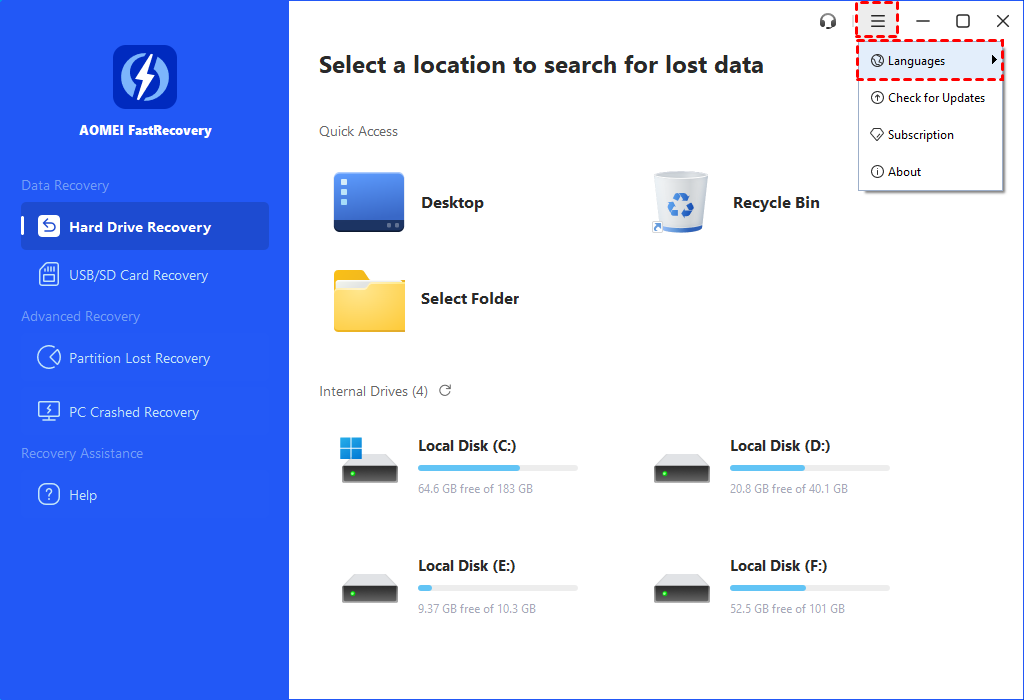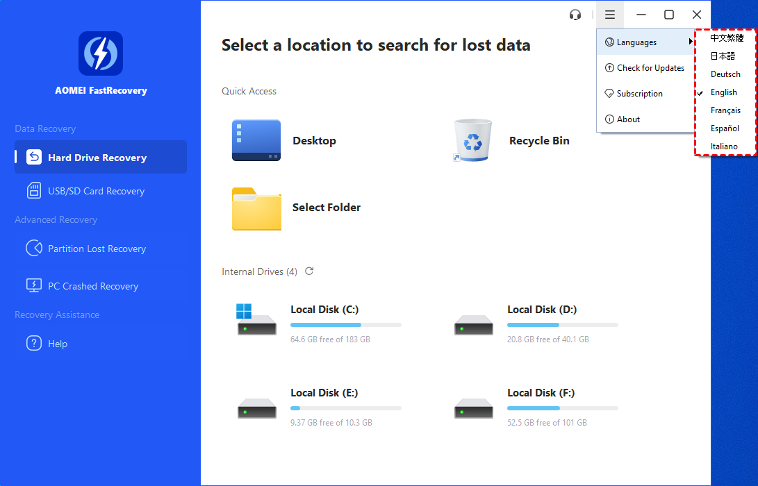 Actualmente, AOMEI FastRecovery admite varios idiomas, incluidos inglés, alemán, francés, japonés, español, italiano y chino tradicional. A continuación se detallan los pasos para cambiar el idioma.