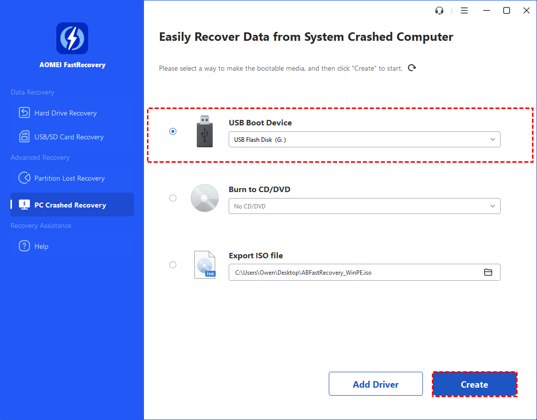 Conecta una memoria USB o inserta un CD/DVD en blanco en tu ordenador. Si no dispones ni de una memoria USB ni de un CD/DVD, AOMEI FastRecovery también te permite crear un archivo ISO de WinPE de arranque, que puedes utilizar para arrancar tus máquinas virtuales o grabar en otros dispositivos.