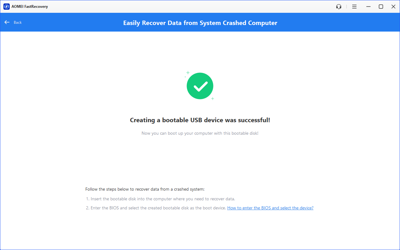 Siguiendo los pasos anteriores, podrás crear fácilmente un disco de arranque con AOMEI FastRecovery. Con este disco de arranque, podrás iniciar fácilmente un ordenador averiado en WinPE y comenzar el proceso de análisis y recuperación de datos. Esto resulta muy útil para recuperar los datos perdidos, especialmente cuando el ordenador se ha dañado.