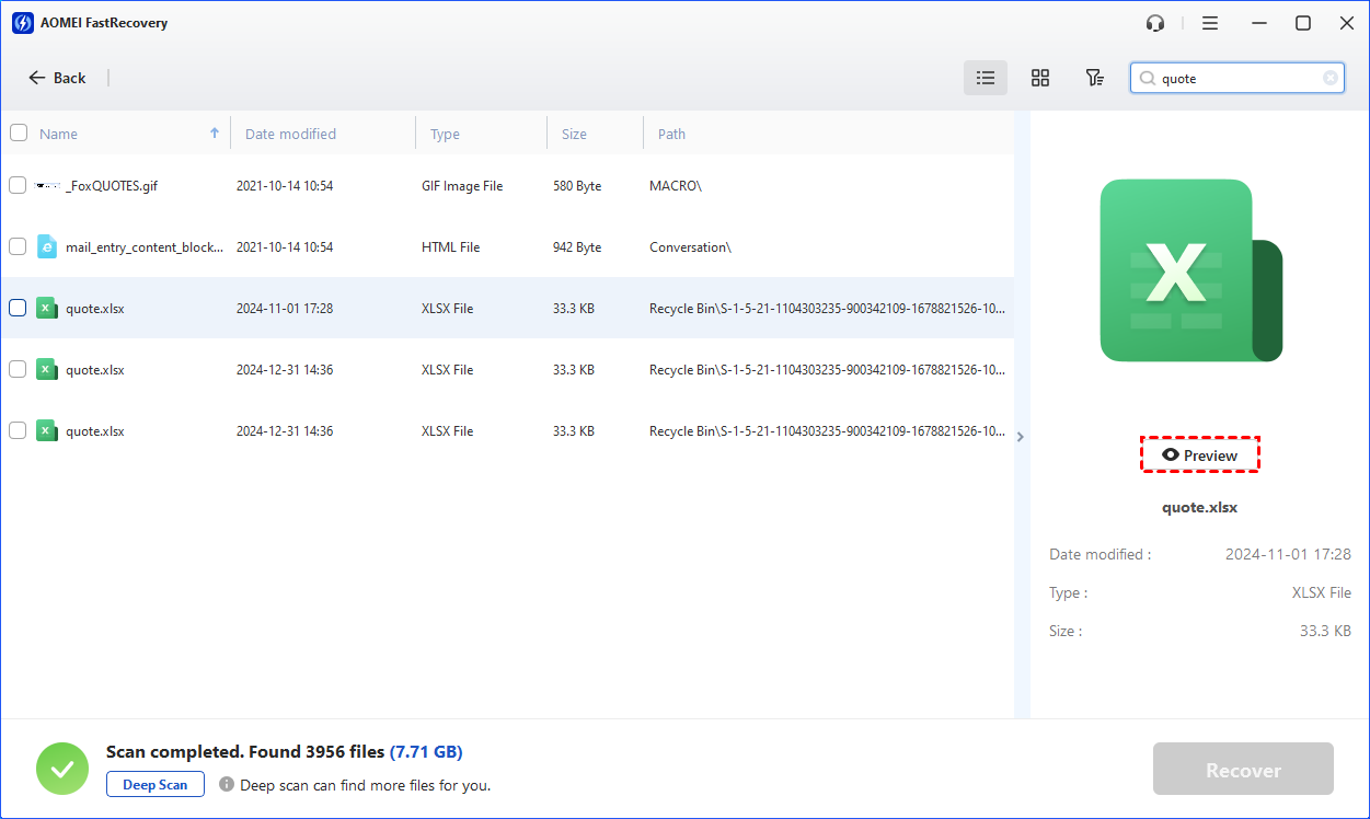 Una vez que los archivos perdidos se encuentren después de un escaneo rápido o profundo en AOMEI FastRecovery, puede previsualizar los archivos encontrados y recuperarlos si es necesario.
