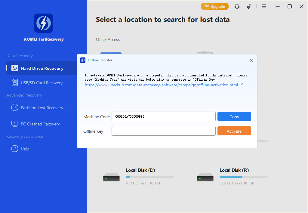 1. Primero, ejecute AOMEI FastRecovery sin conexión a internet y haga clic en el icono "Key". Aparecerá la ventana de registro sin conexión. Luego, conéctese a internet y abra la URL (https://www.ubackup.com/data-recovery-software/campaign/offline-activation.html) en la ventana de registro sin conexión como se muestra a continuación. (O puede abrir la URL en otra computadora con conexión a internet).