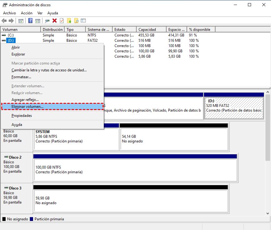 Generalmente, la mayoría de las particiones pueden ser borradas excepto la partición del sistema. Pero cuando intente eliminar el volumen del sistema, la opción Eliminar volumen debe aparecer en gris.