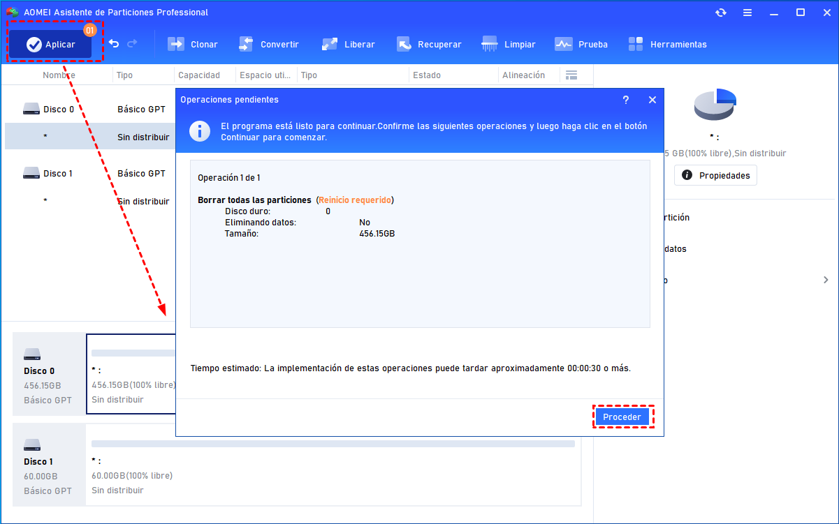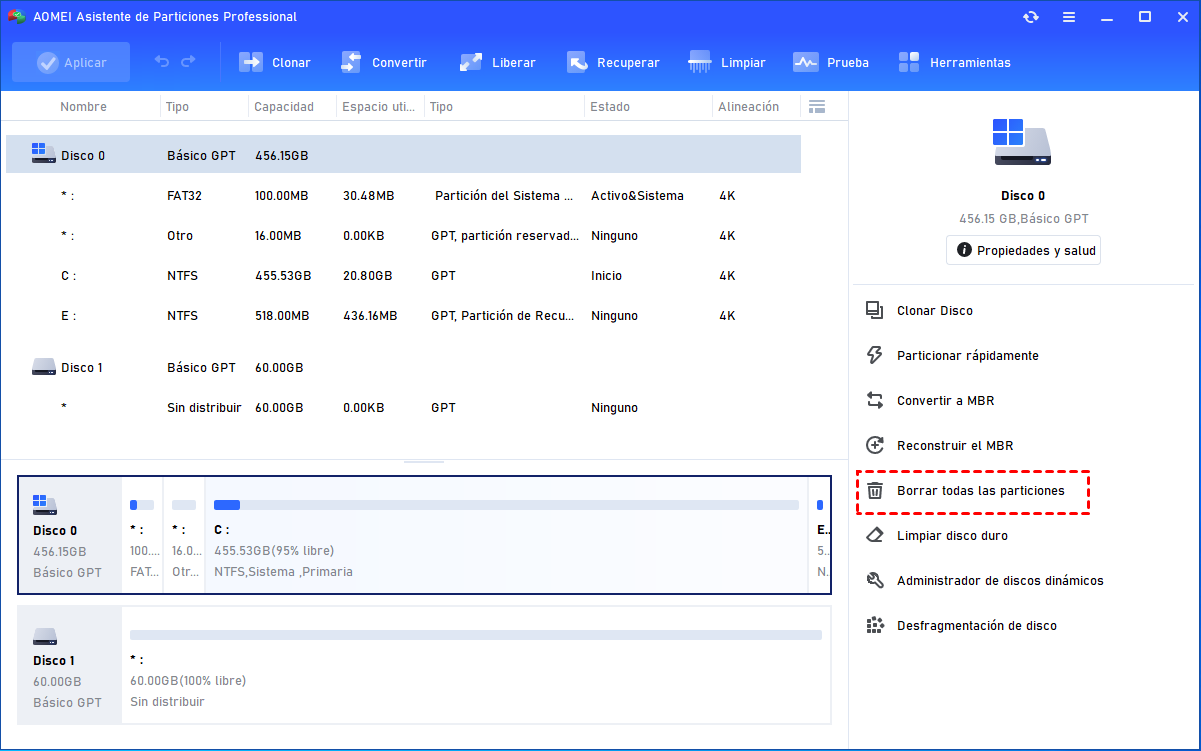 Con Software de particiones AOMEI, puede eliminar todas las particiones de un disco de forma rápida y sencilla, así como realizar otras operaciones avanzadas de gestión de discos, como limpiar discos duros o SSD y volver a crear particiones según sus necesidades. Esto lo convierte en una herramienta completa para administrar y optimizar discos en Windows.