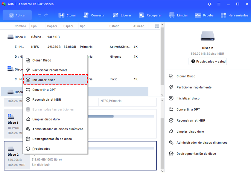 Paso 1. Descargue e instale el Software de particiones AOMEI en primer lugar. Después de abrirlo, haga clic con el botón derecho en el nuevo disco duro y seleccione "Inicializar disco".