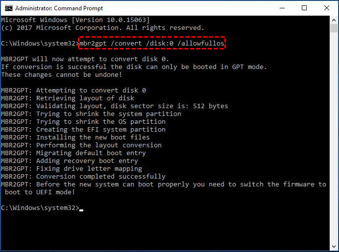 Escriba "mbr2gpt /convert /disk 0 /allowfullos" si hay más de 1 disco en la computadora, y 0 se refiere al número del disco del sistema.