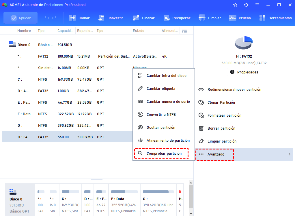 Paso 3. Verá cargado Software de particiones AOMEI una vez iniciada la sesión. Haga clic derecho en la partición del sistema (aquí es la unidad C), seleccione "Avanzado" y luego "Comprobar partición".