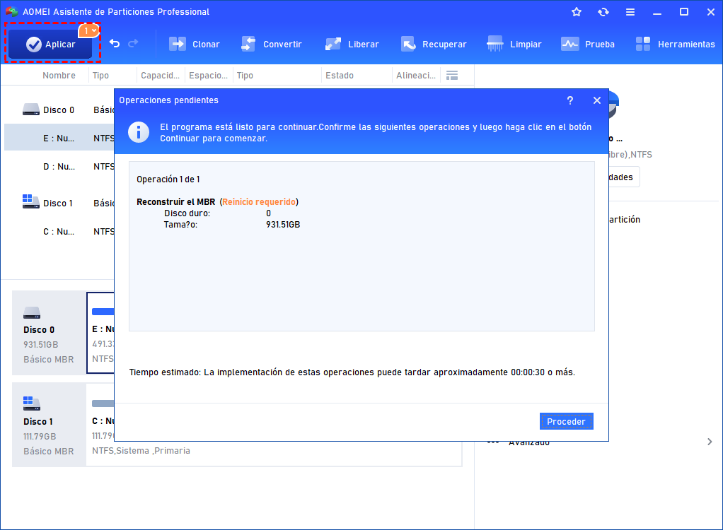 Paso 3. Vea el resultado de la reconstrucción del MBR en "Operaciones pendientes" y pulse "Aplicar" y "Proceder" para que surta efecto.