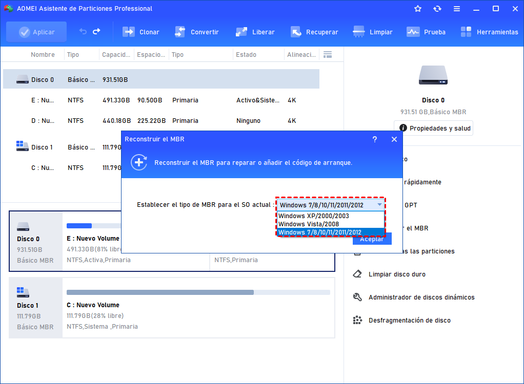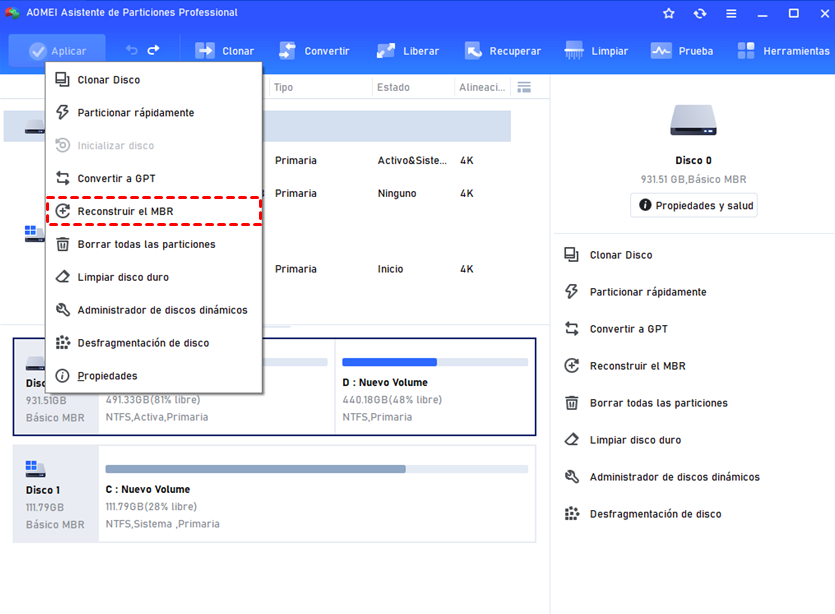 Solución 2: Reconstruir MBR con Software de particiones AOMEI