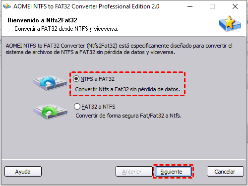 (2) En la ventana emergente, marque "FAT32 a NTFS" o "NTFS a FAT32", haga clic en "Siguiente" y siga las indicaciones para finalizar la conversión.