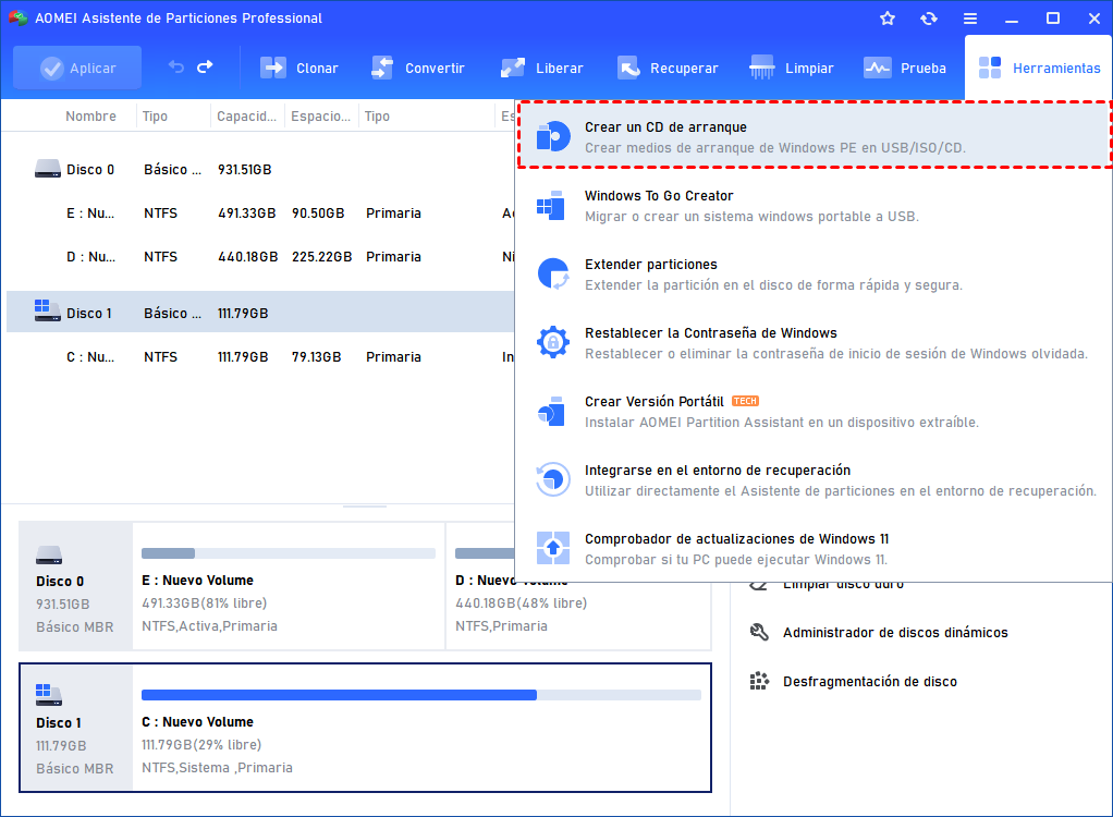 2. En la barra de herramientas superior, haga clic en "Herramientas" > "Crear un CD de arranque".