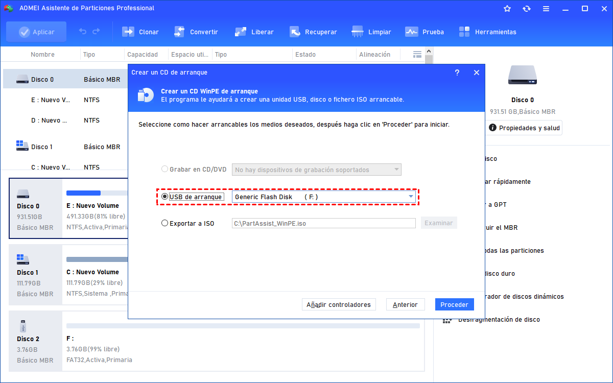 3. Haga clic en "USB de arranque" para seleccionar su unidad flash USB como la ruta para almacenar el archivo ISO. A continuación, haga clic en "Proceder".