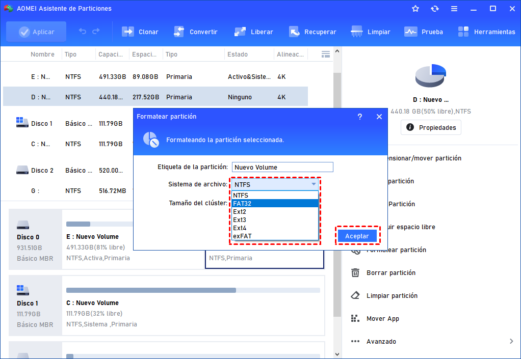Paso 2. Establezca el sistema de archivos de la partición en FAT32 y haga clic en el botón Aceptar. También puede cambiar el tamaño del clúster o añadir una etiqueta a la partición.