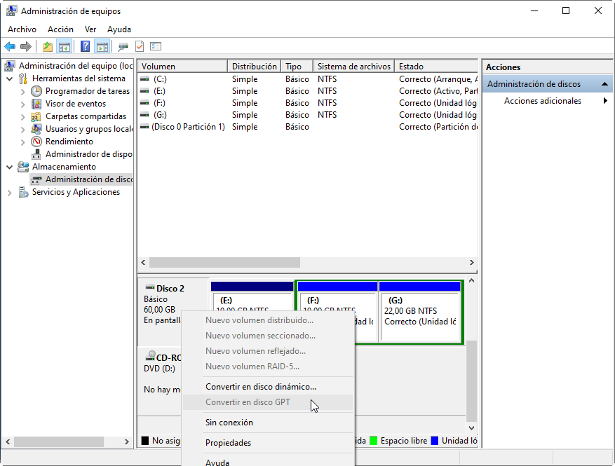Entonces, aquí viene el problema: ¿cómo convertir el disco duro de 3TB de MBR a GPT? La Administración de discos ofrece la función de conversión, pero cuando hace clic con el botón derecho en el disco duro de 3TB, encontrará que Convertir a disco GPT está en gris. Eso es porque esta herramienta sólo puede convertir un disco vacío (sin ninguna partición) a GPT/MBR. Por lo tanto, tiene que eliminar todas las particiones antes de convertir.