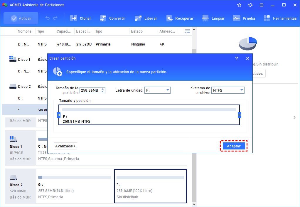Paso 2. A continuación, puede especificar el tamaño de la partición, la letra de la unidad, el sistema de archivos y el tipo de partición de su nueva partición. Haga clic en "Aceptar".