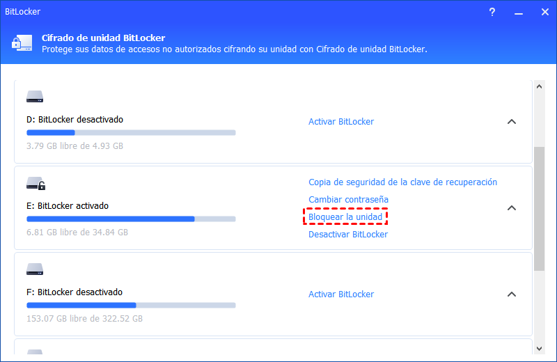 Si una unidad no está bloqueada, haz clic en la opción "Bloquear la unidad" para bloquearla directamente.