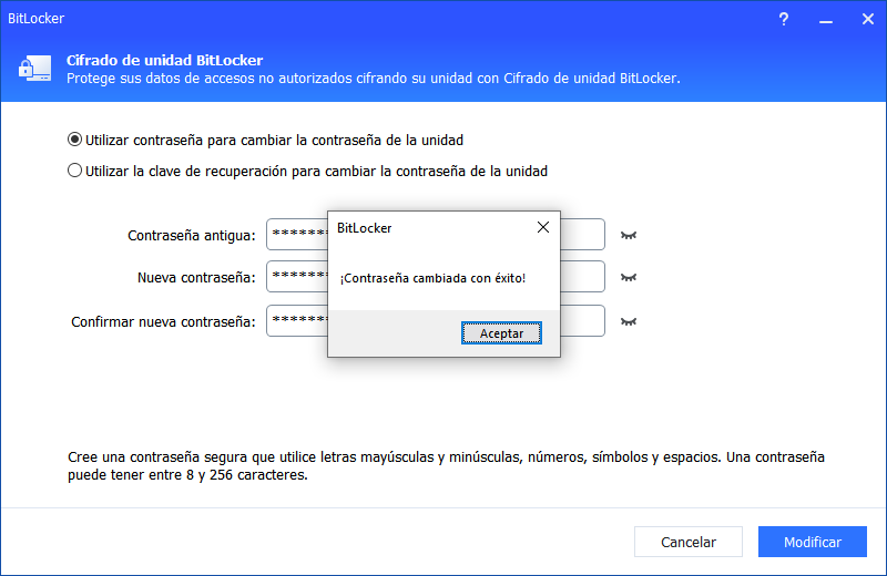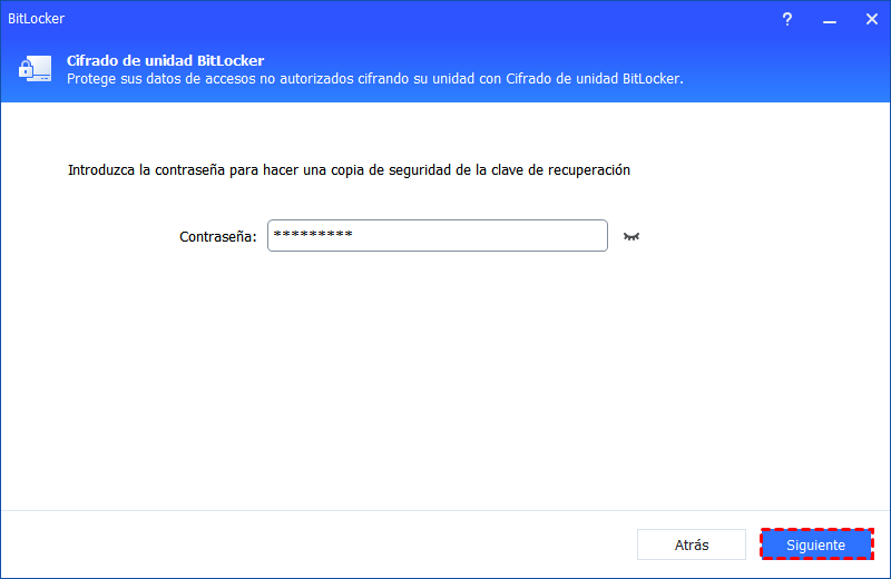 La unidad se desbloqueará si la contraseña/clave de recuperación ingresada es correcta.