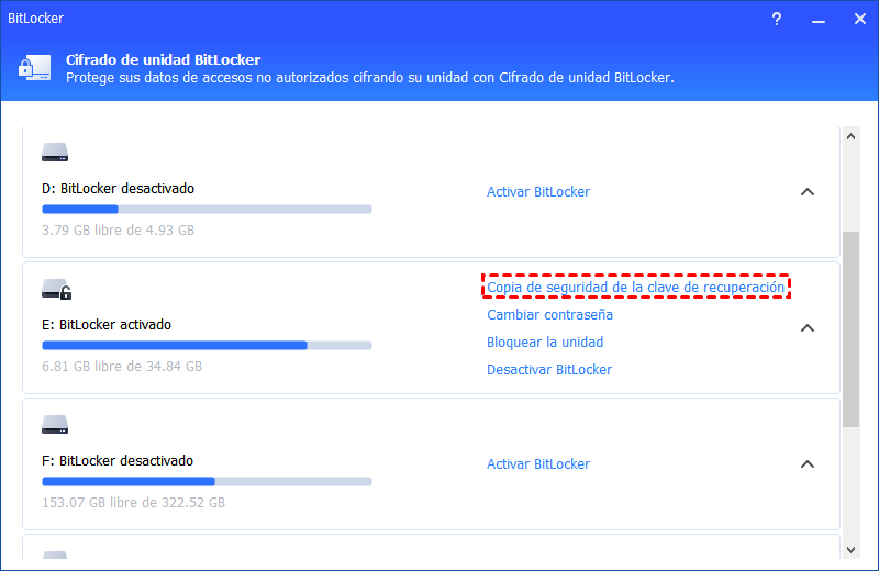 Paso 1. Accede a la unidad cifrada y selecciona "Copia de seguridad de la clave de recuperación".