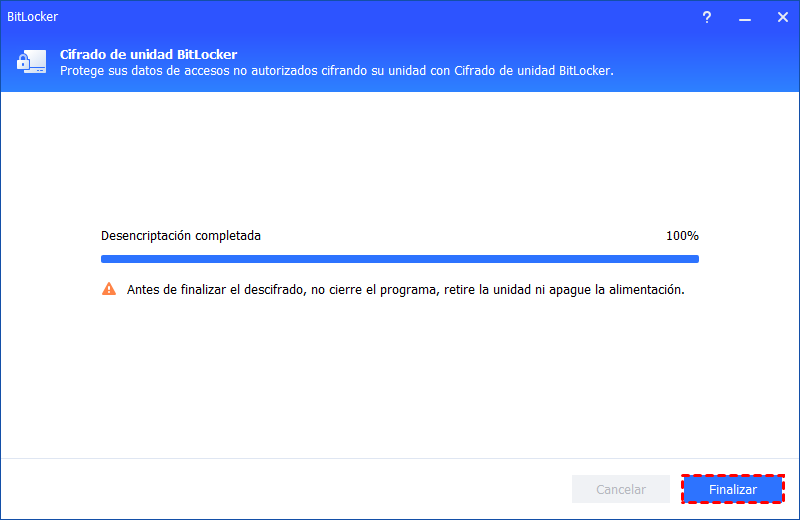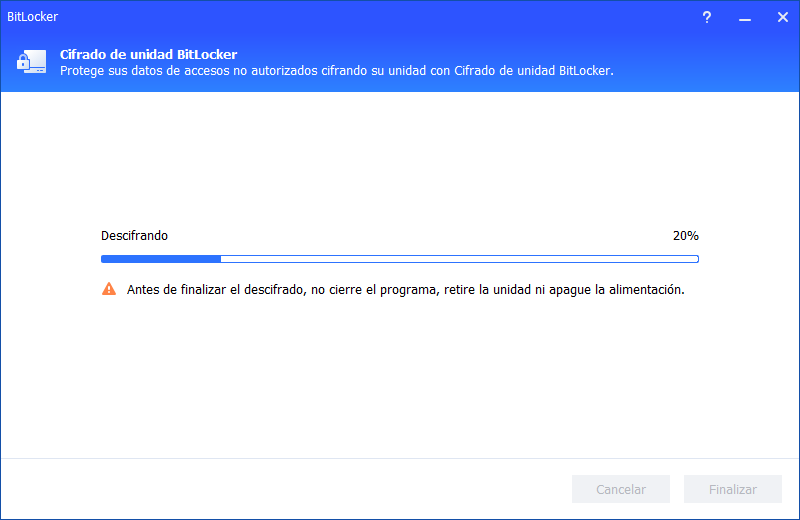 Paso 2. Espera a que se complete el proceso de descifrado. No interrumpas el programa, retires la unidad o apagues la energía.