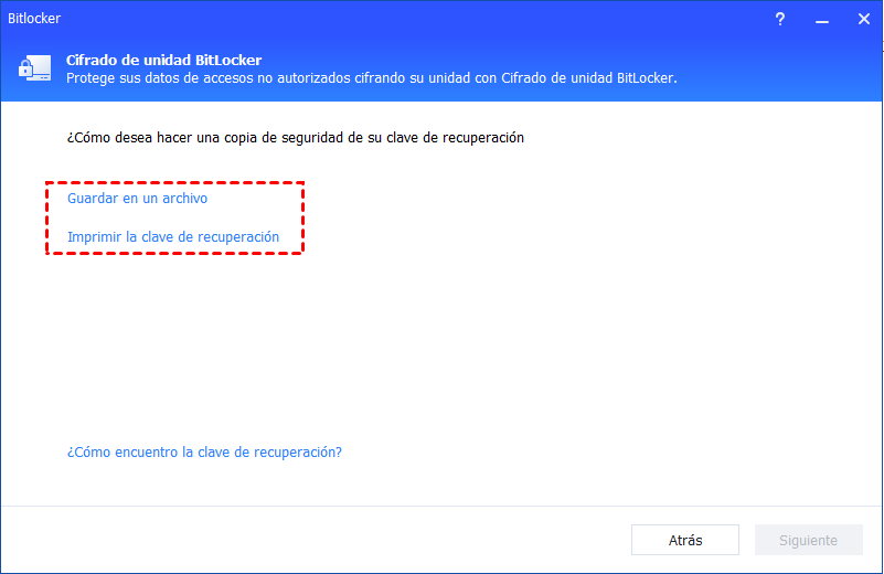 Paso 5. Selecciona una forma preferida para respaldar tu clave de recuperación: "Guardar en un archivo" o "Imprimir la clave de recuperación".