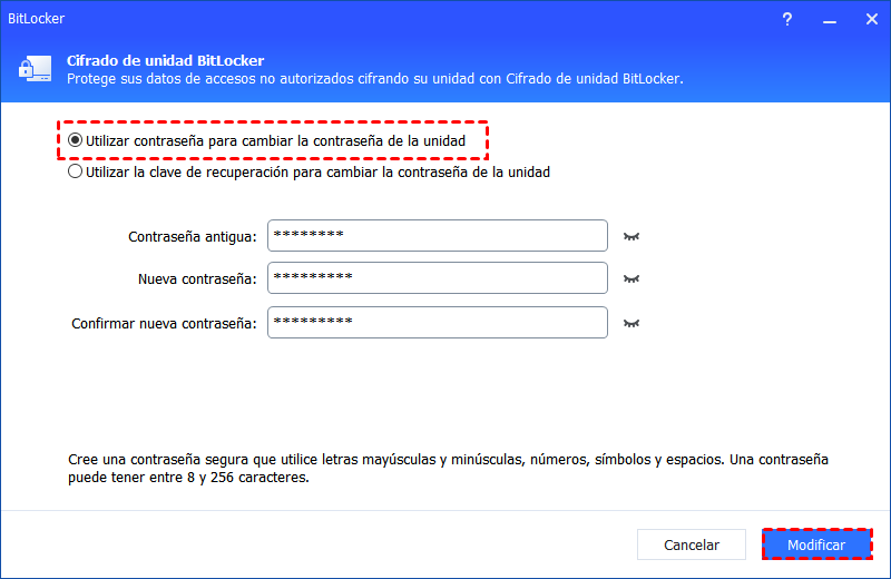 Paso 2. Selecciona tu método preferido: "Utilizar contraseña para cambiar la contraseña de la unidad" o "Utilizar la clave de recuperación para cambiar la contraseña de la unidad".