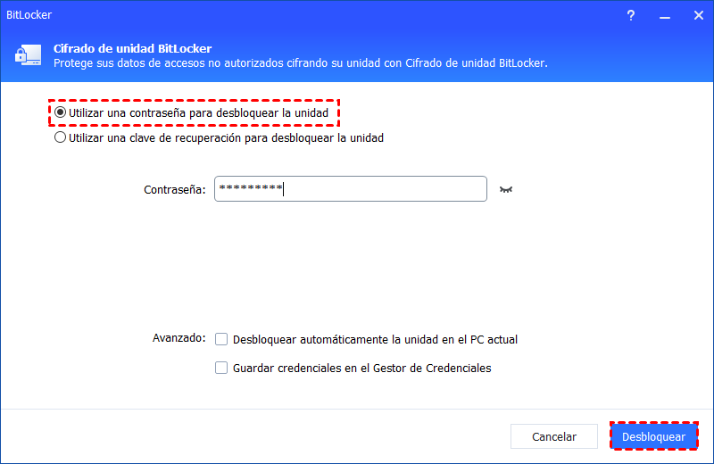 Paso 2. Selecciona una forma preferida: "Utilizar una contraseña para desbloquear la unidad" o "Utilizar una clave de recuperación para desbloquear la unidad". Luego haz clic en "Desbloquear".