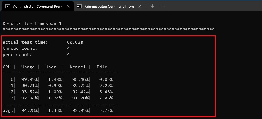 El resultado tiene muchas tablas. La primera sección del resultado muestra el tiempo que tardó el comando en terminar la prueba, así como el número de amenazas y procesadores.