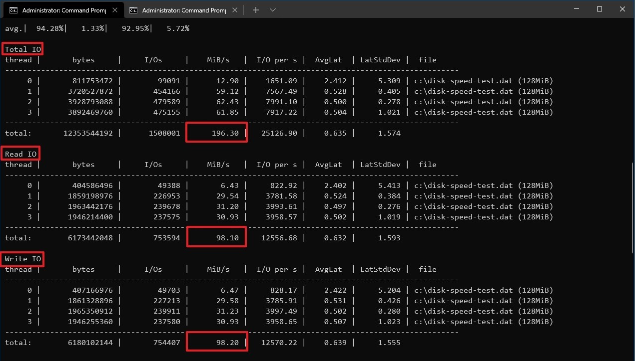 Total IO: Muestr a el número de lecturas y escrituras realizadas por cada hilo. Las estadísticas muestran el rendimiento medio en MB/s. El número total de operaciones de lectura/escritura completadas en un segundo, así como el total de entradas/salidas en ese periodo de tiempo.