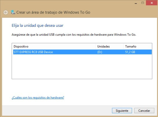 Paso 3. En la ventana Crear un espacio de trabajo de Windows To Go, elija el USB certificado a la que desea transferir Windows 10 y haga clic en "Siguiente".