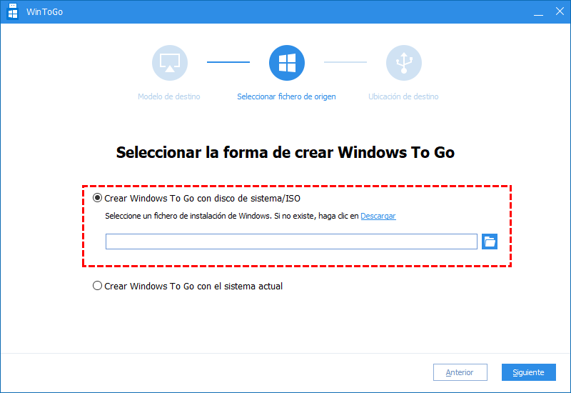 Paso 3. Elija "Crear Windows To Go con sistema de disco/ISO". Si el archivo ISO de Windows 10/11 no se detecta automáticamente, haga clic en el icono de la carpeta para seleccionarlo manualmente. Luego, haga clic en "Siguiente".