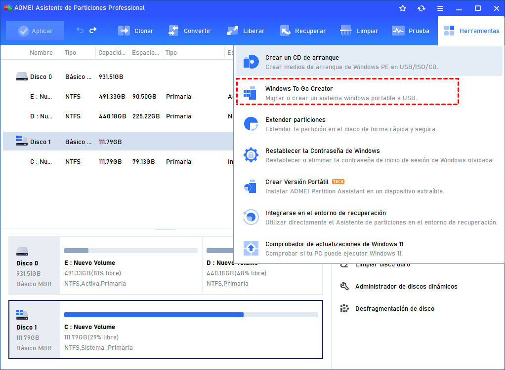 en la pantalla anterior, puede saber que Software de particiones AOMEI Professional también le permite crear Windows ToGo con el sistema actual. Es decir, podrá transferir directamente el sistema operativo actual de su computadora a un USB y hacer que sea de arranque.